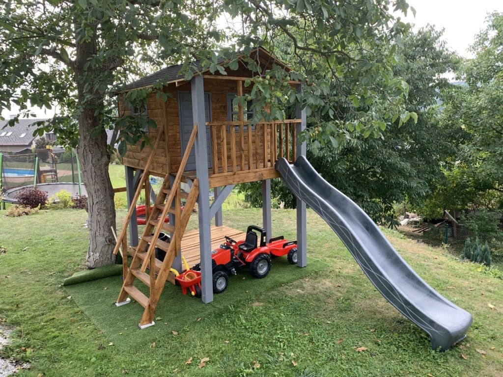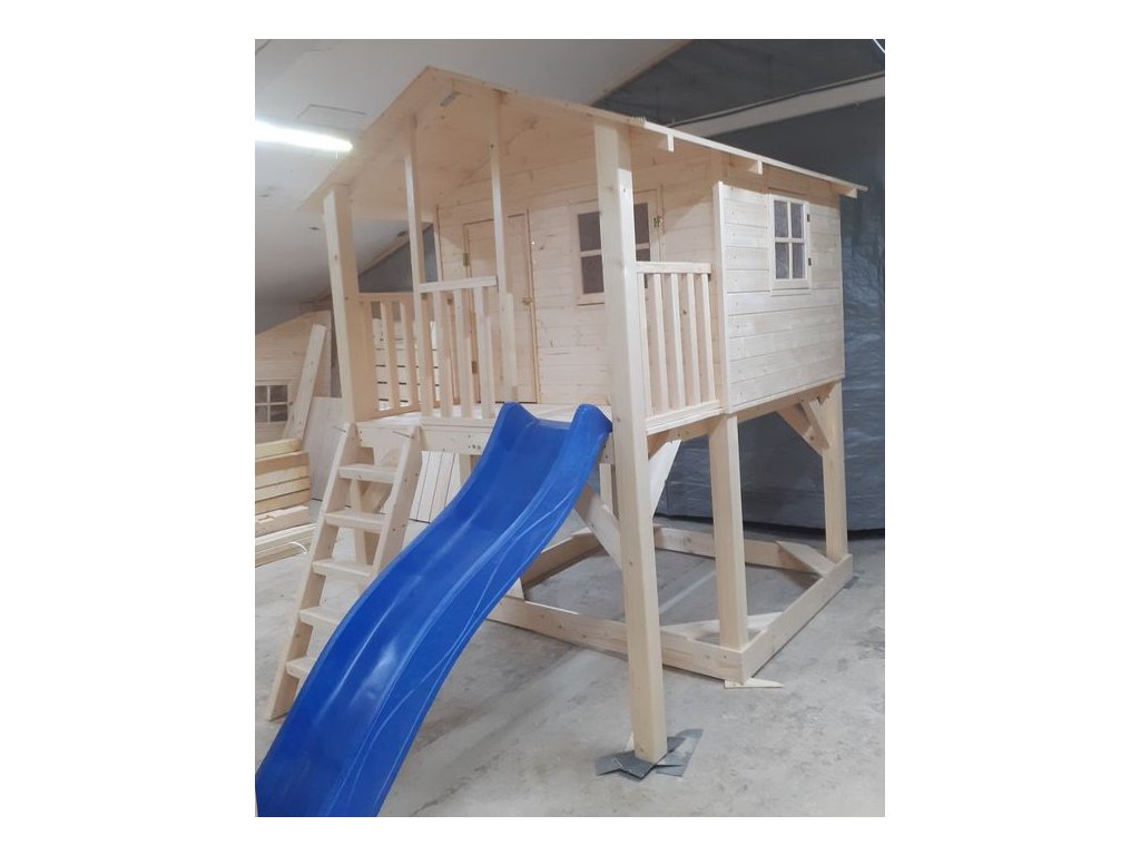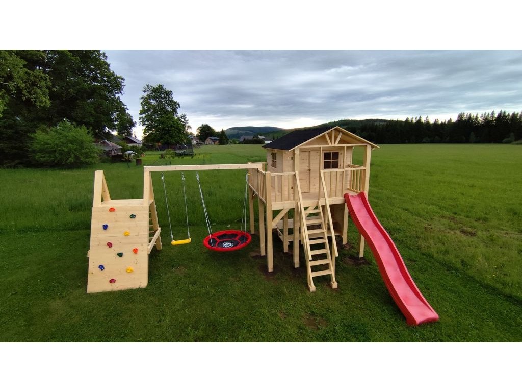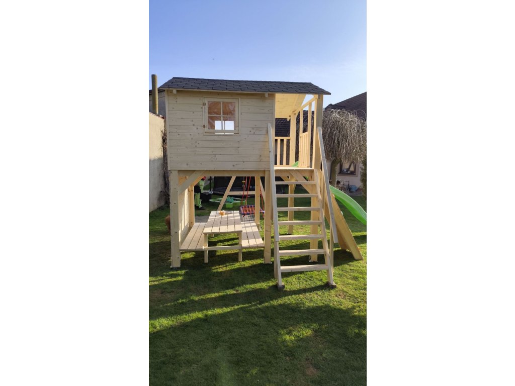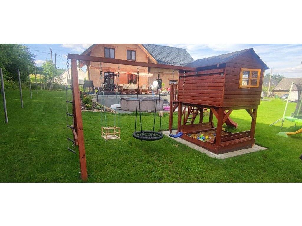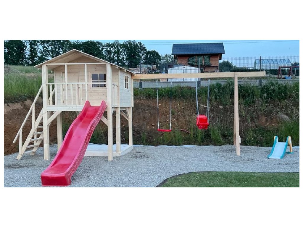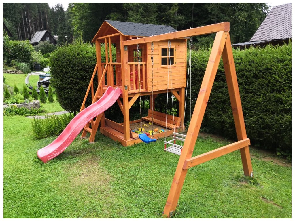 Pískoviště pod domečkem 174x150cm se čtyřmi sedátky, 250cm skluzavkou, třemi okny s plexisklem uzavřené z vnitřní strany západkou, krytou terasou.