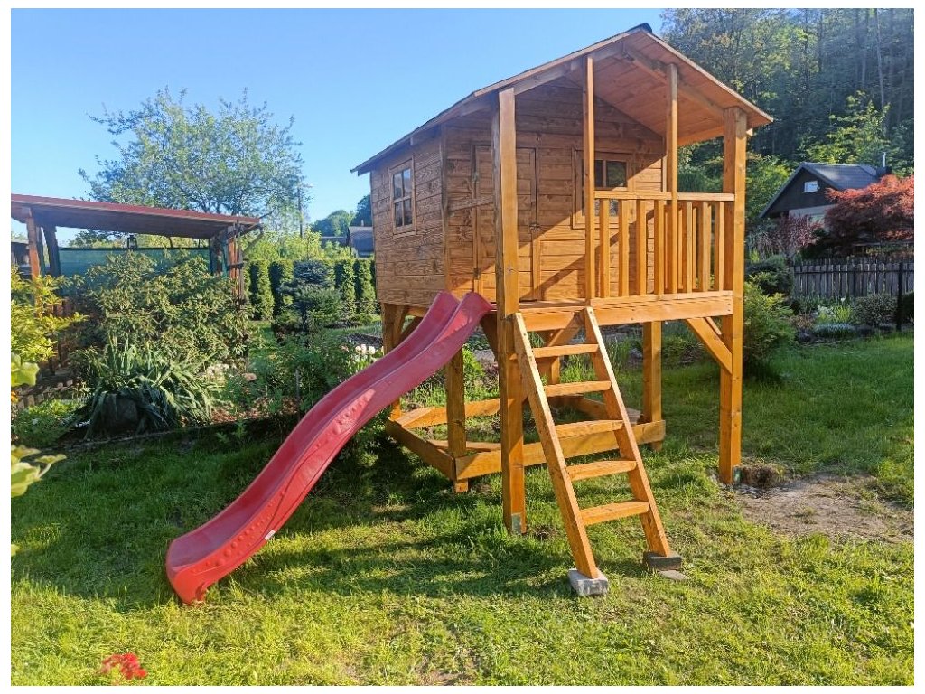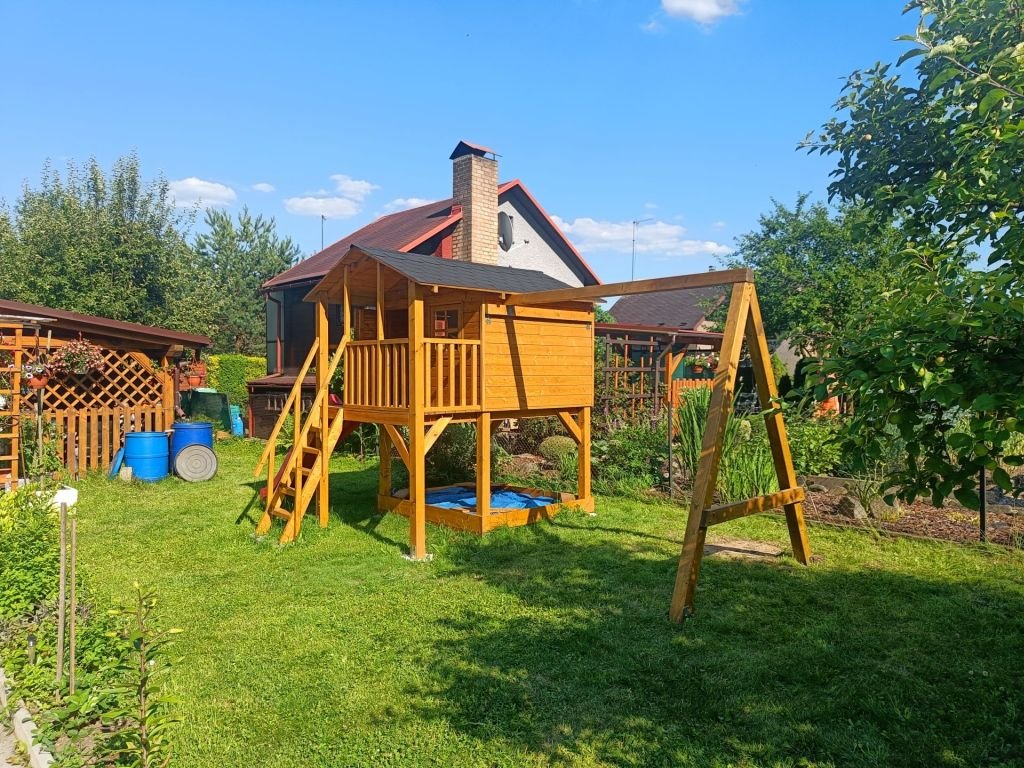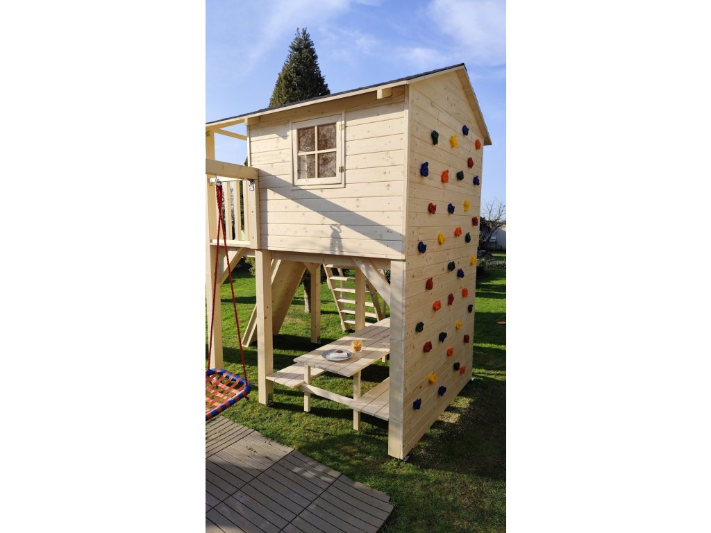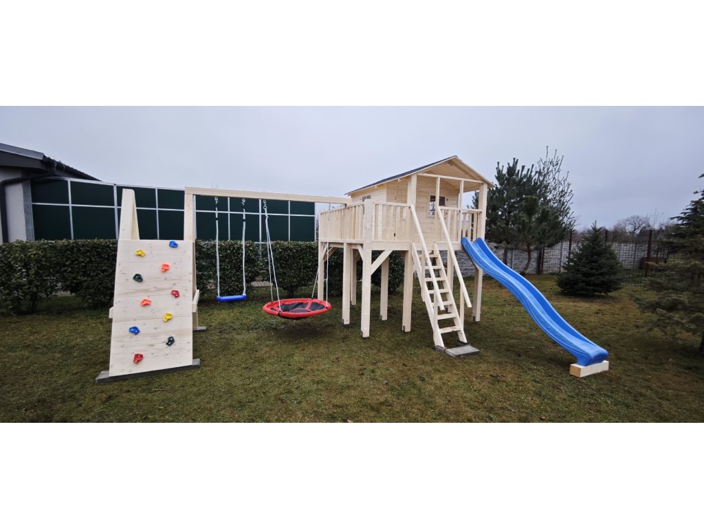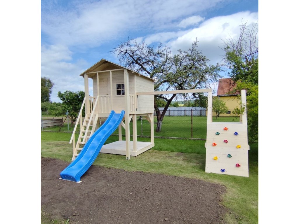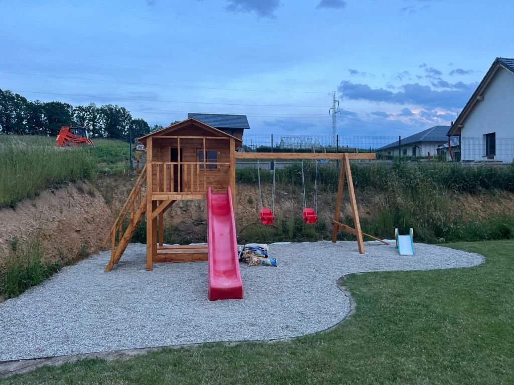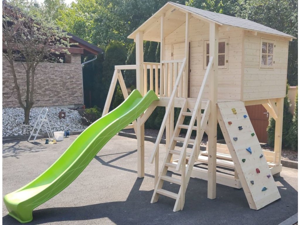 Pískoviště pod domečkem 174x150cm se čtyřmi sedátky, 250cm skluzavkou, třemi okny s plexisklem uzavřené z vnitřní strany západkou, krytou terasou.
