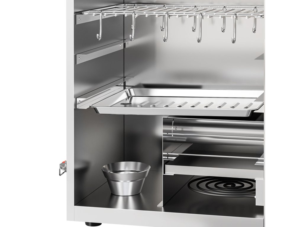 Nastavitelný komín umožňuje kontrolu hustoty kouře, zatímco odkapávací miska zabraňuje odkapávání tuku na udící třísky.