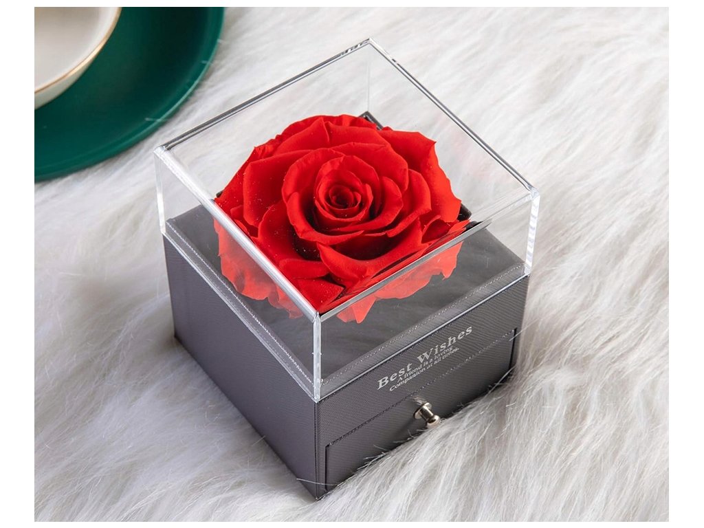 Růže je umělá, takže si zachová svůj vzhled bez péče a zůstane krásnou dekorací na komodě, nočním stolku nebo v kanceláři. Šuplík poskytne místo pro drobnost, která udělá největší radost – prstýnek, náušnice, náramek nebo vzkaz. Díky elegantnímu balení, ozdobné tašce a přání je to ideální volba, když chcete darovat něco „hotového“ a působivého.